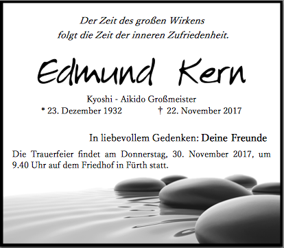 S hlubokým zármutkem v srdci oznamujeme, že ve středu 22.11.2017 v 11:44 hodin SEČ odešel náš Sensei, Mistr a drahý přátel Edmund Kern.